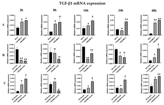 qRT-PCR expression of TGF-β1 mRNA in total cellular RNA of uninfected or H1N1 or Sendai virus-infected A549 cells in normal or +10 mM glucose or +25 mM glucose concentration. 106 A549 cells were cultured in DMEM medium supplemented with 10% FCS in normal glucose (25 mM), +10 mM glucose (35 mM), and +25 mM glucose (50 mM). Cells remained uninfected (A), or they were infected with H1N1 virus (B) or Sendai virus (C) for 2, 8, 16, 24, and 48 h. At different times after infection, cells were collected and total cellular RNA was isolated. cDNA was subjected to qRT-PCR to detect the relative expression of TGF-β1 (β actin mRNA level was used as a reference), n = 3, * refers to statistical difference between the samples in the corresponding higher glucose concentrations compared to NG, * p < 0.05 and ** p < 0.005. All tests were carried out in duplicates or triplicates.