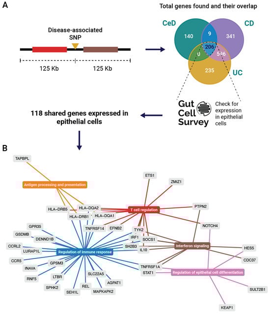 With the rapid worldwide rise in the incidence of gut-related autoimmune diseases such as celiac disease (CeD) and inflammatory bowel diseases (IBDs), there is an increasing need for novel diagnostic and treatment approaches [,]. Gaining a better understanding of the mechanisms underlying their pathology is key to this effort. While dietary gluten (see Appendix A, glossary) acts as the environmental driver for CeD, the drivers for IBD are still unknown. Nevertheless, extensive research has been undertaken to understand the immunopathology of these diseases (Appendix B) and how it is affected by genetic factors. Genome-wide association studies (GWASs) have now firmly established the significance of genetics in CeD and IBD, uncovering hundreds of single nucleotide polymorphisms (SNPs) associated to these diseases. However, 90% of associated genetic variants are located in the non-coding genome, where they could influence gene expression in specific cell types through disruptions in gene regulatory elements such as promoters or enhancers []. To date, the role of these SNPs in disease is not well understood, nor is it clear in which cell types these SNPs are relevant.