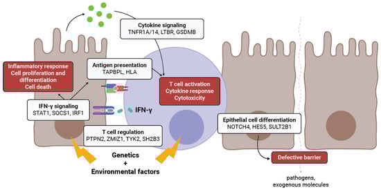 Thus far, SNPs associated with autoimmune diseases have most often been studied in immune cells, but they could also affect other cell types, including the epithelial cells that make up the physical barrier along the gastrointestinal tract that is affected in CeD and IBD. This barrier defends against potentially harmful molecules and microorganisms and manages the uptake of essential nutrients and solutes (Appendix C). Barrier disruption may lead to the increased influx of gluten peptides, a CeD hallmark, or increased exposure to harmful microbial components, as in IBD, which may increase the risk of disease onset [,]. In both CeD and IBD, immune cell infiltration, microbiome dysbiosis, and an increased influx of proinflammatory external epitopes are hallmarks of disease []. However, it remains unclear whether barrier defects are a cause or consequence of autoimmunity. In this review, we outline possible roles of CeD-/IBD-associated genetics in barrier dysfunction and epithelial immune function.