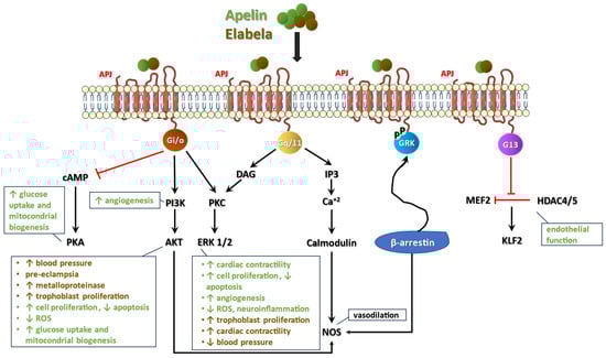 APJ interaction with G proteins leads to the modulation of many signaling pathways and cellular functions after ligand binding (Figure 1): (i) the activation of the phospho-inositide 3-kinase (PI3K)/Akt and protein kinase C (PKC)/extracellular signal-regulated kinase 1/2 (ERK 1/2) pathways; (ii) the downregulation of protein kinase A (PKA) by inhibiting adenylate cyclase and cAMP production; (iii) the upregulation of phospholipase C beta (PLCβ), which triggers the generation of diacylglycerol (DAG) and inositol 1,4,5-triphosphate (IP3), thus leading to the initiation of the PKC cascade and the intracellular release of Ca2+ respectively [9,10]. Furthermore, apelin binding induces the autophosphorylation of APJ through G protein-coupled receptor kinase (GRK) and starts G protein-independent signaling mediated by β-arrestin [10,11]. Finally, APJ has been shown to activate G13 in human umbilical vein endothelial cells, leading to the modulation of endothelial function [12]. Both apelin and APJ are highly conserved among species and widely expressed in tissues, including brain, spinal cord, heart, lung, placenta, endocrine glands, bone marrow, skeletal and smooth muscles, gastrointestinal and urinary organs, and adipose tissue [13]. Activation of APJ signaling modulates several physiological processes. Specifically, it is involved in the regulation of cell proliferation and migration, apoptosis, glucose metabolism, mitochondrial biogenesis, and energetic homeostasis [12]. It promotes brown adipocyte differentiation and the browning of white fat, angiogenesis, neuroinflammation, oxidative stress, nitric oxide release and vasodilation (by relaxing the smooth muscle cells of blood vessels), cardiac contractility, and heart rate [12]. Moreover, pituitary secretion, food intake, body fluid homeostasis, glucose metabolism, and the neuroendocrine stress response are regulated by APJ-dependent intracellular pathways, as well as immune and gastrointestinal functions [12]. The great heterogeneity of apelin/APJ’s biological actions is mainly explained by the interaction of APJ with different G proteins and intracellular pathways, according to cell type, microenvironment, and apelin isoforms [12], as reported in Figure 1.