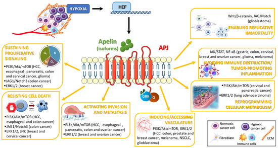 The hallmarks of cancer are defined as functional capabilities acquired by cells as products of multistep processes, and crucial for their transition from normalcy to neoplastic growth states [46]. Among those, the apelin/APJ system has been reported to directly interact with “sustaining proliferative signaling”, “resisting cell death”, “activating invasion and metastasis”, “inducing/accessing vasculature”, “reprogramming cellular metabolism”, “avoiding immune destruction” and “tumor-promoting inflammation”, and “enabling replicative immortality” (Figure 2).