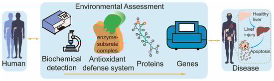 The current toxicological mechanisms of contaminants are often studied using a single assay, which does not provide a comprehensive and objective picture of the toxicological effects and mechanisms of contaminants on cells. Therefore, it is vital to find a method that reflects the toxicological mechanisms of contaminants as a whole. This study utilized heterogeneous gene–disease–trait networks [13] to develop the BAPG-chain model. The model is an advanced evaluation framework that integrates biochemical detection, antioxidant defense systems, proteins, and genes to investigate environmental toxicity mechanisms. The study aimed to investigate the toxicity of BP-3 and its primary metabolite, BP-1, in humans, and their plausible mechanisms (Figure 1). The BAPG-chain model advances the field in assessing the cytotoxic mechanisms of contaminants. Our study systematically describes the toxic effects of BP-1 and BP-3 on human cells and provides new insights into their potential mechanisms.