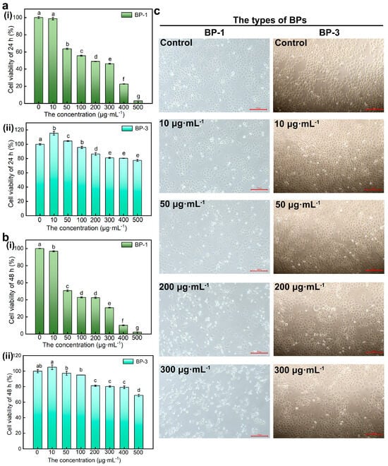 The effect of BPs with different concentrations on cell viability and morphology. (a): The effect of BP−1 with different concentrations on cell viability (Lowercase letters a–g denote p < 0.05 as obtained using one-way analysis of variance) (i) Cell viability of 24 h, (ii) Cell viability of 48 h. (b): The effect of BP−3 with different concentrations on cell viability (Lowercase letters a–e denote p < 0.05) (i) Cell viability of 24 h, (ii) Cell viability of 48 h. (c): The effect of BPs with different concentrations on cell morphology (Scale bar: 100 μm).