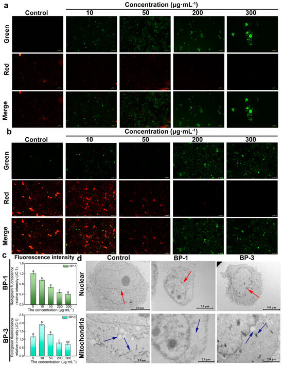 Changes in mitochondrial membrane potential (MMP) and ultrastructure. (a): The effect of BP-1 on MMP (Scale bar: 100 μm). (b): The effect of BP-3 on MMP (Scale bar: 100 μm). (c): Relative intensity of red/green fluorescence of BPs (Lowercase letters denote p < 0.05). (d): Ultrastructure of cells in the presence of BPs (Scale bar of nuclear: 5.0 μm; Scale bar of mitochondria: 2.0 μm) (The red arrow points to the nucleus, and the blue arrow points to the mitochondria).