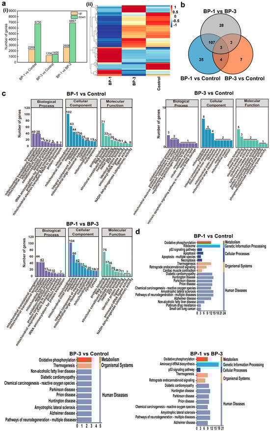 RNA sequencing analysis of SMMC-7721 cells after BP intervention. (a): DEGs in different groups. (b): Venn diagrams of significantly DEGs related to mitochondria, oxidative stress, and apoptosis. (c): GO functional analysis of significantly DEGs. (d): KEGG pathway enrichment analysis of significantly DEGs. ((i) Number of DEGs in different groups, (ii) Heat map of DGEs related to mitochondrial function, oxidative stress, and apoptosis).
