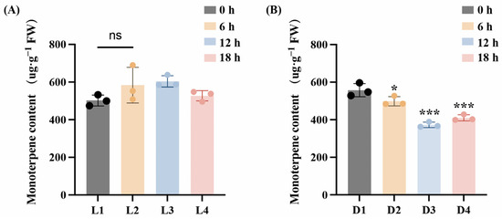 Changes of monoterpene content in L. cubeba fruits under light and darkness treatments. (A) The monoterpenoid content of L. cubeba fruits under light treatment (L1–L4). L2, L3, and L4 are compared with L1. (B) The monoterpenoid content of L. cubeba fruits under darkness treatment (D1–D4). D2, D3, and D4 are compared with D1. All data are expressed as means ± SD of three biological replicates (* p < 0.05, *** p < 0.001, Ns indicates that there is no significant difference.).