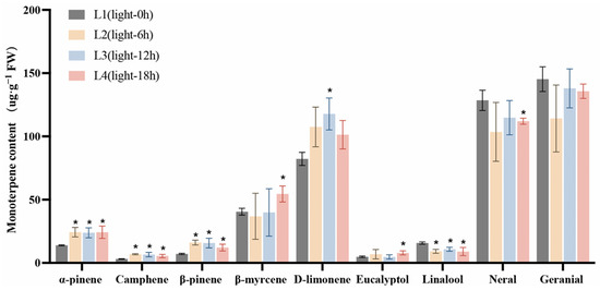 The effects of light treatment (L1–L4) on monoterpenoid content in L. cubeba fruits. The contents of α-pinene, camphene, and β-pinene were significantly increased under light treatment, whereas those of linalool, neral, and geranial were decreased at L3 (Light-12 h). L2, L3, and L4 are compared with L1. All data are expressed as means ± SD of three biological replicates (* p < 0.05).