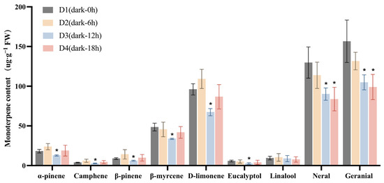 The effects of darkness treatment (D1–D4) on monoterpenoid content in L. cubeba fruits. Except for linalool, the contents of other monoterpenoids were significantly decreased at the D3 stage (Dark-12 h), whereas those of neral and geranial showed a further decrease at the D4 stage (Dark-18 h). D2, D3, and D4 are compared with D1. All data are expressed as means ± SD of three biological replicates (* p < 0.05).