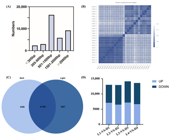 Through RNA sequencing and analysis, a total of 41,822 genes were detected. Among them, a total of 37,721 genes were expressed in the transcriptome, with the transcript length distribution shown in Figure 4. Genes with lengths of 501–1500 bp accounted for the largest proportion of the transcriptome (16,304; 43%), followed by those with lengths greater than 2000 bp (9231; 24%) (Figure 4A). The correlation coefficient of the 24 samples from light and darkness treatments is shown in Figure 4B. The higher the correlation coefficient, the better the quality between samples. The overlapping area shows the number of genes common to both light and darkness samples (Figure 4C). Differential expression analysis was performed using DEG2seq with a false discovery rate threshold adjusted cutoff of <0.05 and a fold change cutoff of |log2(FoldChange)| ≥ 1. Figure 4D presents the numbers of upregulated and downregulated DEGs across the four sampling times (L1 vs. D1, L2 vs. D2, L3 vs. D3, and L4 vs. D4) under light and darkness treatments.