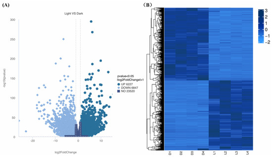 Differential gene expression profiles. (A) Upregulated (dark blue) and downregulated (sky blue) DEGs between light and darkness treatments (L1-L2-L3-L4 vs. D1-D2-D3-D4). The horizontal dashed line indicates the significance threshold (a p-value of <0.05). (B) Hierarchical clustering of the DEGs between light and darkness treatments (L1–L4 and D1–D4).