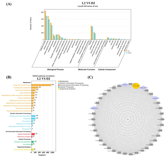 GO, KEGG, and WGCNA analysis of the DEGs (L2 vs. D2). (A) GO enrichment analysis of the DEGs (L2 vs. D2) was categorized into biological process, molecular function, and cellular component. (B) The DEGs (L2 vs. D2) were enriched in five KEGG metabolic pathway categories. Different colors represent different categories, and the numbers after the pathways represent the number of single genes in the different categories. (C) Construction of regulatory networks of TFs and structure genes related to terpenoid biosynthesis. Yellow represents the key enzyme ADH in the terpenoid synthesis pathway, and purple represents transcription factors.
