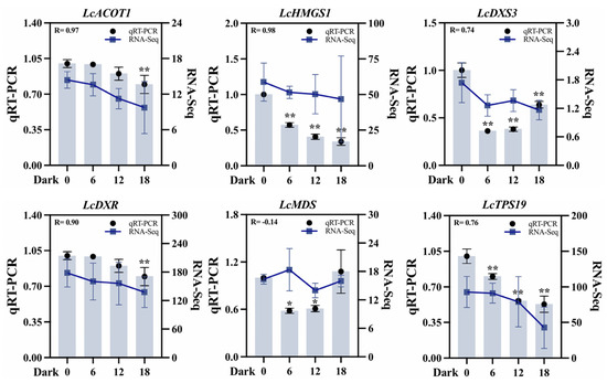 To validate the transcriptome dataset, six DEGs associated with terpenoid biosynthesis were selected: two from the MVA pathway (LcACOT1, LcHMGS1), three from the MEP pathway (LcDXS3, LcDXR, LcMDS), and one terpenoid synthase-encoding gene (LcTPS19). Quantitative analysis revealed that the expression patterns of most of these genes were highly consistent with the transcriptome data. For instance, LcACOT1 exhibited a Pearson correlation coefficient of 0.97 with transcriptome data across the four darkness treatment stages (D1–D4), alongside a significant positive association (R = 0.88) with terpene accumulation under darkness treatment. In addition, the correlation between the qRT-PCR results for LcHMGS1 and LcDXR and the transcriptome data reached a value above 0.8 (Figure 8). Discrepancies were observed for LcMDS, potentially attributable to differences in sensitivity and specificity between qRT-PCR and sequencing technology. Collectively, qRT-PCR validation substantiated the reliability of the transcriptome data and the derived gene expression profile.