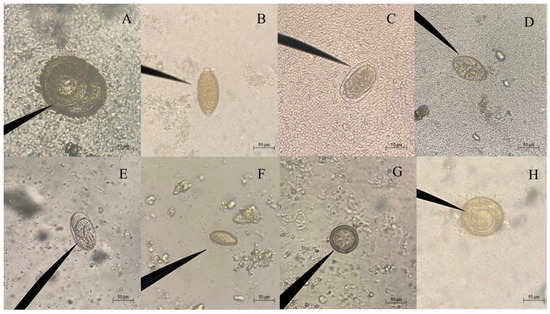 The parasite eggs found in the feces of cats and dogs under 400× magnification are examined using the modified formalin-ether concentration technique (FECT). (A) Toxocara spp.; (B) Trichuris sp.; (C) Ancylostoma sp.; (D) Spirometra sp.; (E) Strongyloiodes sp.; (F) Opisthorchis sp.; (G) Taenia sp.; and (H) Hymenolepis sp.