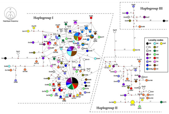 The 185 TkD1Int5 sequences of O. viverrini from a previous study [21] together with 10 sequences of O. viverrini-like eggs generated in this study were used to construct a haplotype network. This network separated the sequences into three distinct haplogroups (I–III) based on mutational steps (ms) greater than 20. Haplogroup I is the largest group, containing haplotypes of O. viverrini from various localities, including three haplotypes of O. viverrini-like eggs, namely Ov117, Ov119, and Ov122. Haplotypes Ov116 and Ov120–Ov123 of O. viverrini-like eggs were grouped in haplogroup II. No haplotype of O. viverrini-like eggs was found to belong to haplogroup III (Figure 2). Interestingly, the Ov118 haplotype from Cat2 and the Ov10 haplotype from a cyprinid fish in Khon Kaen Province were genetically distinct from the others, with more than 20 mutational steps. These haplotypes did not cluster within any of the haplogroups identified in this study (Figure 2).
