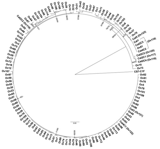 A phylogenetic tree constructed using TkD1Int5 haplotypes of O. viverrini and O. viverrini-like eggs, with Clonorchis sinensis as the outgroup, showed that O. viverrini-like eggs from cats in this study formed a monophyletic group with O. viverrini from cyprinid fish from various localities in Thailand and Lao PDR. However, there appears to be evidence of a cat-specific genotype group, including haplotypes Ov117, Ov119, and Ov120 (Figure 3).