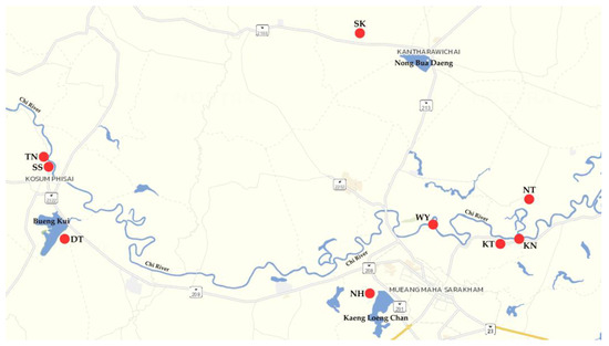 Map of the nine villages where the study sites are located in the Chi River Basin, Maha Sarakham Province, Thailand, as indicated by red dots. See Table 1 for more details on each village.