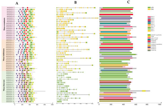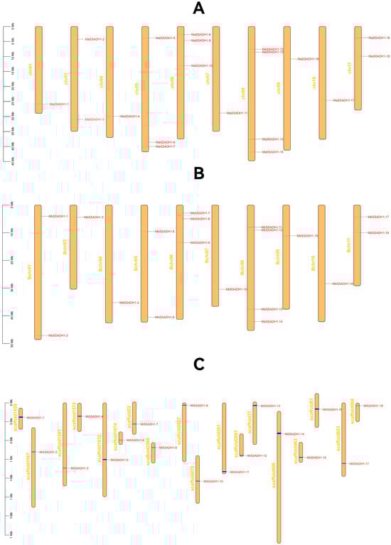 We respectively mapped MaSSADH, MbSSADH, and MiSSADH to the Musa acuminata, Musa balbisiana, and Musa itinerans chromosomes to study their chromosomal distribution (Figure 3). As depicted in Figure 4, the 19 MaSSADHs exhibited an uneven distribution across 10 chromosomes, accounting for approximately 5/6 of the 12 chromosomes present in Musa acuminata. The 18 MbSSADH members were distributed on 10 chromosomes. Notably, the M. itinerans genome is a Scaffold-level genome. MiSSADH was localized on 18 scaffolds(S).