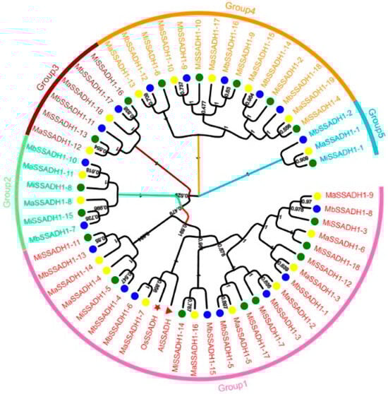 To investigate the phylogenetic relationship between the SSADH proteins and their homologs from other species, we created phylogenetic trees (Figure 2). The 57 sequences were divided into five groups, MaSSADH1-9 to MiSSADH1-11, MbSSADH1-7 to MbSSADH1-10, MaSSADH1-12 to MiSSADH1-16, MaSSADH1-13 to MiSSADH1-4, and MbSSADH1-2 to MiSSADH1-1.