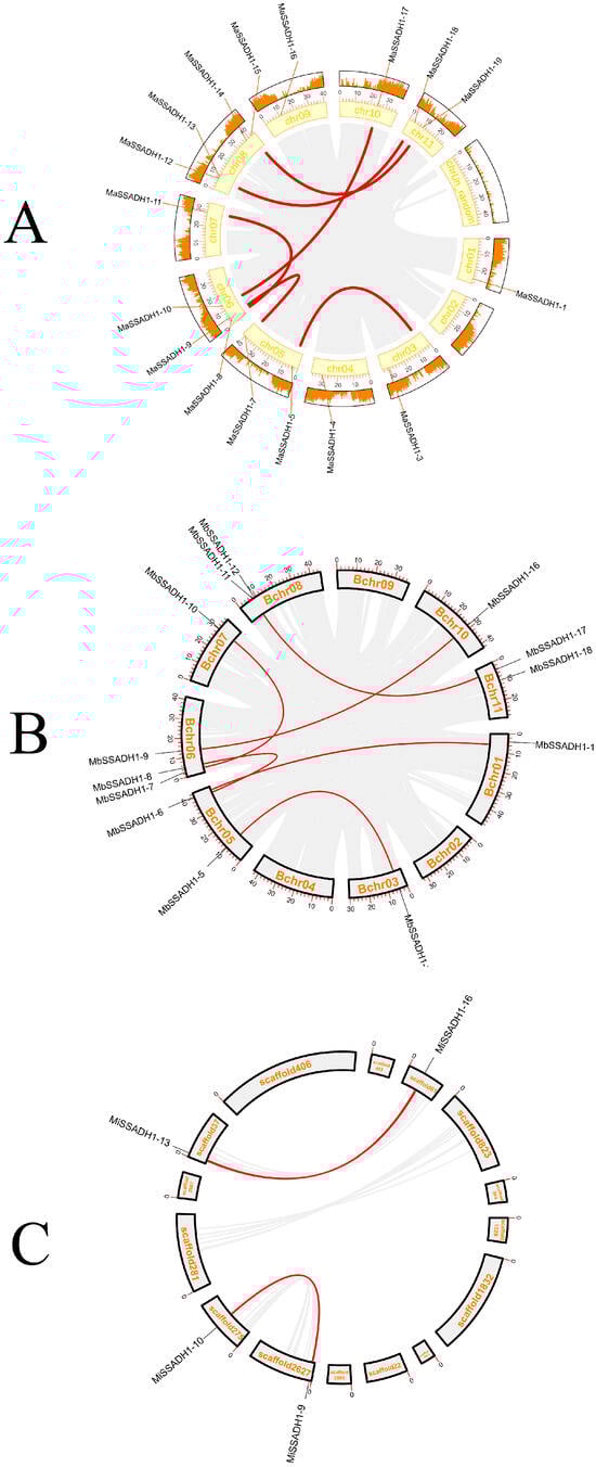 Collinearity visualization between MaSSADHs, MbSSADHs, and MiSSADHs.