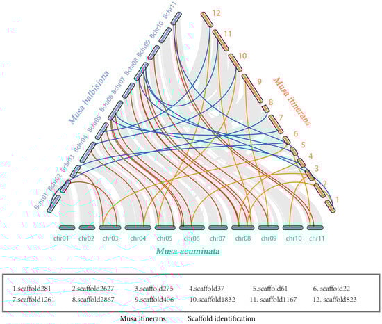 To enhance comprehension of the evolutionary trajectory and source of the SSADH gene family, collinearity maps were generated comparing the three varieties of bananas (Figure 5). Based on the collinearity analysis among the three genomes of Musa acuminata, Musa balbisiana, and Musa itinerans, 26 gene pairs between MaSSADHs and MbSSADHs, 20 gene pairs between MaSSADHs and MiSSADHs, and 12 gene pairs between MbSSADHs and MiSSADHs were found. However, the sequence assembly of the Musa itinerans genome is fragmented and of weak continuity, being in the Scaffold(S) stage, the collinearity with the other two banana species is unclear. These results suggest that the MiSSADHs and MbSSADHs are closer to the MaSSADHs than between them.