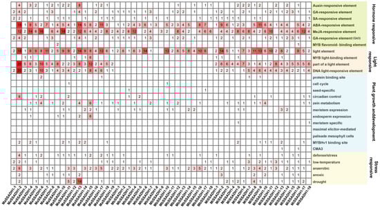 Cis-acting of SSADH promoter elements in Musa acuminata, Musa balbisiana, and Musa itinerans. The color depth of the square represents the number of cis-acting elements.