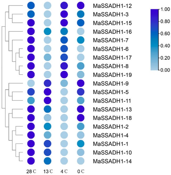 The expression levels of all 19 MaSSADHs were investigated thoroughly using a rigorous transcriptome analysis procedure based on public transcriptomic data of different temperatures of “Sanmingyeshengjiao”(Figure 8). The treatment at 4 °C led to the differential expression of 19 MaSSADHs. And two genes (MaSSADH1-3 and MaSSADH1-13) were upregulated, and 17 were downregulated. The expression of the MaSSADH1-1, MaSSADH1-2, MaSSADH1-4, MaSSADH1-10, and MaSSADH1-14 were differentially downregulated from 28 °C to 0 °C. The expression levels of MaSSADH1-13 and MaSSADH1-18 were downregulated from 28 °C to 4 °C and increased from 4 °C to 28 °C. And MaSSADH1-5, MaSSADH1-9, and MaSSADH1-11 had higher expression in 13 °C.