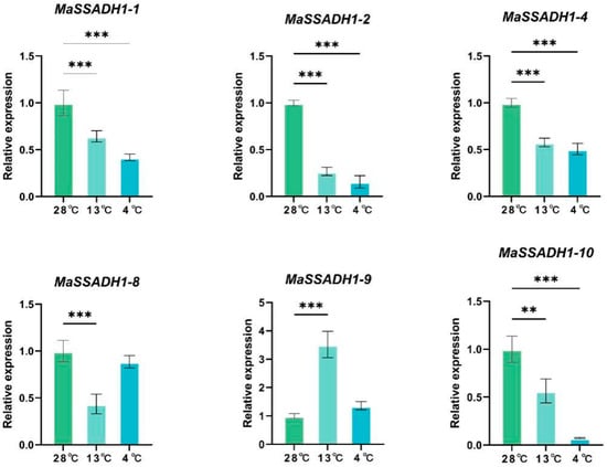 Expression patterns of nine MaSSADHs under temperature treatment at 28, 13, and 4 °C by qRT-PCR. The data represent the mean ± standard deviation (SD) of three replicates. ** and *** are significantly different from the control at p < 0.01 and 0.001, respectively.