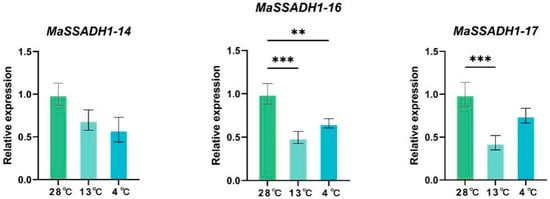 To investigate the expression pattern of SSADH members under cold treatment, the expression patterns of nine randomly selected MaSSADH genes in different stages at low temperatures (4 °C, 13 °C, and 28 °C) were determined by qRT-PCR. The qRT-PCR results demonstrated that nine MaSSADH genes exhibited significant differences, showing expression patterns consistent with the transcriptome findings. And most of the genes were significantly downregulated under cold treatment (Figure 9). It is noteworthy that MaSSADH1-9 were highly expressed under cold treatment. In addition, MaSSADH1-1, MaSSADH1-2, MaSSADH1-4, MaSSADH1-9, MaSSADH1-10, and MaSSADH1-14 exhibited the highest expression levels at 13 °C. MaSSADH1-8, MaSSADH1-16, and MaSSADH1-17 exhibited a comparatively elevated expression level following cold treatment at 4 °C.