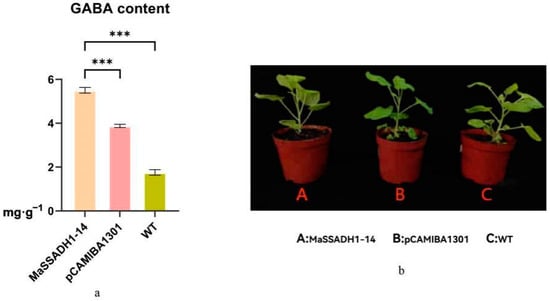The information diversity of SSADH gene family members in banana are relatively limited. Based on the previous expression analysis, we selected MaSSADH1-14, hypothesizing that it may be involved in the accumulation of GABA in banana. Therefore, we used a transient expression system in N. benthamiana leaves to validate the functions of the genes. In this study, we selected GUS as a screening marker. Compared with the wild type, the GABA composition was changed greatly in the transgenic tobacco (from 1.76 mg/g to 5.52 mg/g). The content of GABA was remarkably higher in positive transgenic tobacco than in wild-type (p < 0.001), indicating that the MaSSADH1-14 may contribute to the accumulation of storage GABA in N. benthamiana leaves (Figure 11).