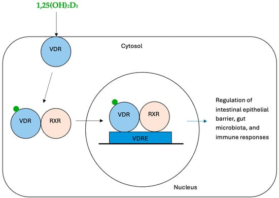 After Vitamin D binds to VDR, one way in which it exerts its biological effects is by forming a heterodimer with the Retinoid X Receptor (RXR), another nuclear receptor involved in the regulation of various key physiological process and inflammatory pathways [5]. The VDR–RXR complex subsequently translocates to the nucleus, where it binds to Vitamin D Response Elements (VDREs) in the promoter regions of target genes. By recruiting coactivators or corepressors, this complex modulates gene expression to exert its regulatory functions [6] (Figure 2).