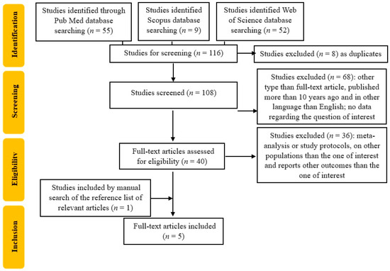 For our study, we conducted a reproductible protocol following the recommendations of Preferred Reporting Items for Systematic Reviews and Meta-Analyses (PRISMA) for the systematic review protocol checklist (protocol number: CRD42024559012). In addition, the Population, Intervention, Comparison, Outcome, and Study Design (PICOS) strategy was used in order to guide our research principle to obtain a comprehensive, beneficial, and systematic literature analysis. Firstly, we used the following criterion for our search: “(skin autofluorescence OR SAF) AND (gestational diabetes mellitus OR GDM)”. We identified 116 articles (52 on the Web of Science, 9 on the Scopus database, and 55 on the PubMed database). Secondly, we assessed that the studies resulted by the search engine were according to our inclusion criteria, i.e., only full-text original articles, randomized control trials, and clinical trials, published in English, in the last ten years (from 1 January 2014 to 17 November 2024), conducted only on the adult human population. The exclusion criteria covered other types of articles than original ones, such as letters to editors; reviews and comments along with meta-analyses; studies published more than 10 years previously; those involving other populations than adult human populations; and those in other languages than English.