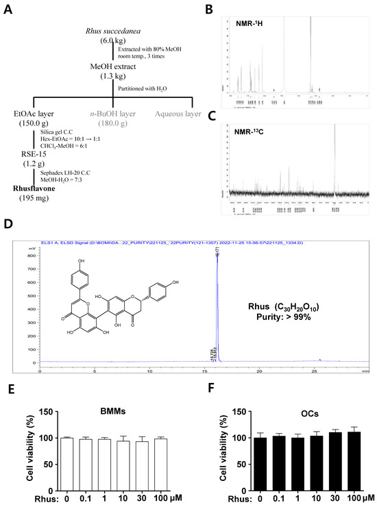 Extractoin of Rhusflavone (Rhus) from the dried roots of Rhus succedanean and its cytotoxicity effects. (A) Procedure for the isolation of Rhus. (B,C) 1H-NMR (500 MHz, CD3OD) spectrum (B) and 13C-NMR (125 MHz, CD3OD) spectrum (C) of Rhus. (D) HPLC analysis of the isolated Rhus. The inset shows the chemical structure, purity, and molecular formula. (E,F) Bone marrow macrophages (BMMs) were seeded onto 96-well plates and treated with the indicated Rhus concentration for 24 h (E). The BMMs were differentiated into osteoclasts using 30 ng/mL macrophage colony-stimulating factor (M-CSF) and 100 ng/mL receptor activator of nuclear factor kappa B ligand (RANKL) for 3 days, and the cells were subsequently treated with the indicated Rhus concentration (F). Cell viability was assessed using the 3-(4,5-dimethylthiazol-2-yl)-2,5-diphenyl tetrazolium bromide (MTT) assay. OCs: osteoclasts. The data presented are derived from three separate experiments and are expressed as the mean ± standard deviation (SD).
