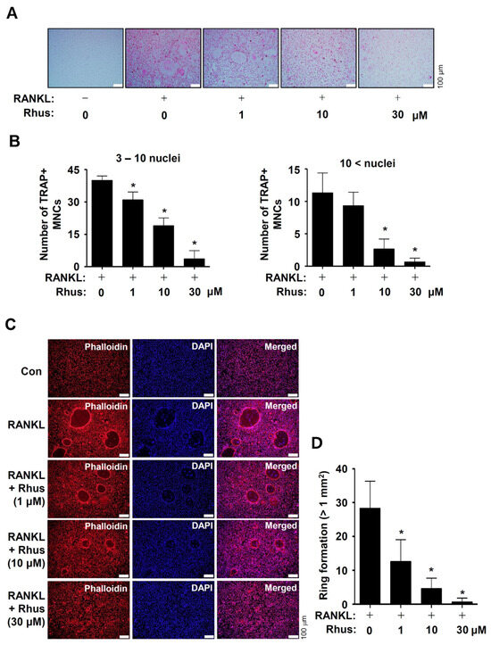 To investigate the potential activities of Rhus on osteoclast differentiation, the BMMs were differentiated by RANKL and M-CSF in the presence or absence of 1–30 μM Rhus. Osteoclastogenesis was analyzed using tartrate-resistant acid phosphatase (TRAP) staining. Rhus dose-dependently suppressed both TRAP-positive staining and TRAP-positive multinucleated osteoclast (MNC) formation (Figure 2A,B). Additionally, Rhus reduced the number of giant osteoclasts compared to RANKL (Figure 2A,B). TRAP is a distinctive marker of osteoclast differentiation that is highly expressed during bone resorption in mature osteoclasts. To demonstrate the inhibitory effect of Rhus on mature osteoclasts, we investigated its effects on osteoclastic bone resorption using an F-actin ring formation assay. Rhus treatment dose-dependently impaired mature F-actin ring formation (Figure 2C,D). Compared with the RANKL-treated osteoclasts, Rhus-treated osteoclasts exhibited fewer and smaller F-actin rings (Figure 2C,D). These results suggest that Rhus suppressed osteoclastogenesis and the ability of mature osteoclasts to resorb bone.