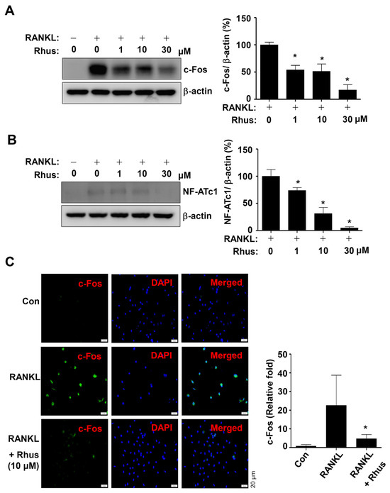 The effects of Rhus on RANKL-induced osteoclast-specific transcription factors c-Fos and NFATc1 were examined to better understand the mechanisms underlying its inhibitory effects on osteoclastogenesis. The BMMs were differentiated using RANKL for 1 or 2 days in the presence or absence of Rhus. Rhus treatment dose-dependently downregulated c-Fos and NF-ATc1 expression levels compared to RANKL treatment (Figure 3A,B). Furthermore, immunofluorescence analyses confirmed that c-Fos was significantly induced in the RANKL-treated group, whereas c-Fos induction was blocked by treatment with Rhus (Figure 3C). These results suggest that Rhus inhibits osteoclastogenesis by inhibiting osteoclast-specific transcription factors.