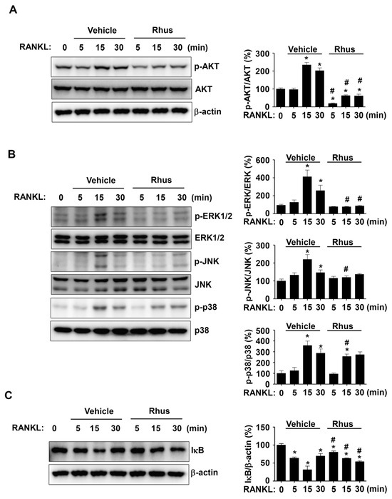 Effects of Rhusflavone (Rhus) on receptor activator of nuclear factor kappa B ligand (RANKL)-induced intracellular signaling pathways. (A–C) Bone marrow macrophages (BMMs) were seeded on 6-well plates and stimulated in 100 ng/mL RANKL with 10 μM Rhus for the indicated time. AKT, p-AKT, and β-actin (A); ERK, p-ERK, JNK, p-JNK, p38, and p-p38 (B); IkB and β-actin (C) expression were investigated using western blot analysis. The relative level (%) is presented as a bar graph. *, p < 0.05 compared to RANKL treatment alone at 0 min. #, p < 0.05 compared between RANKL alone and RANKL + Rhus at each min time point. The data presented are derived from three separate experiments and are expressed as the mean ± standard deviation (SD).