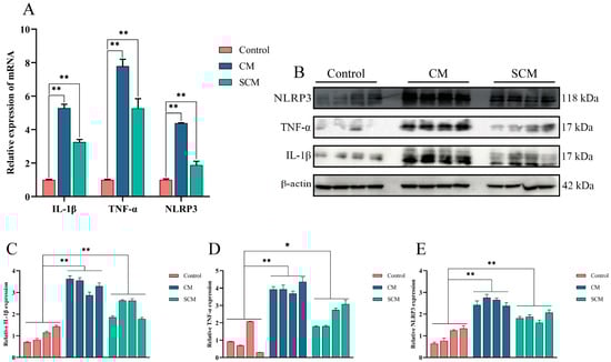 To assess the immune environment in bovine mammary tissue, qPCR and Western blot were used to evaluate the expression of IL-1β and TNF-α, as well as the activation of the NLRP3 inflammasome, in tissues from healthy cows (control) and those with clinical (CM) and subclinical mastitis (SCM). Compared with the control group, both the CM and SCM groups showed significantly elevated levels of IL-1β, TNF-α, and NLRP3 (Figure 1).