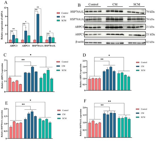To examine changes in ARPC3, ARPC4, and HSP70 expression in bovine mastitis, qPCR and Western blot were used to determine the levels of ARPC3, ARPC4, HSP70A1A, and HSP70A1L in tissues from healthy cows (control) and cows with CM and SCM. Both mRNA and protein levels of these markers were significantly elevated in the CM and SCM groups compared with the control group (Figure 3).