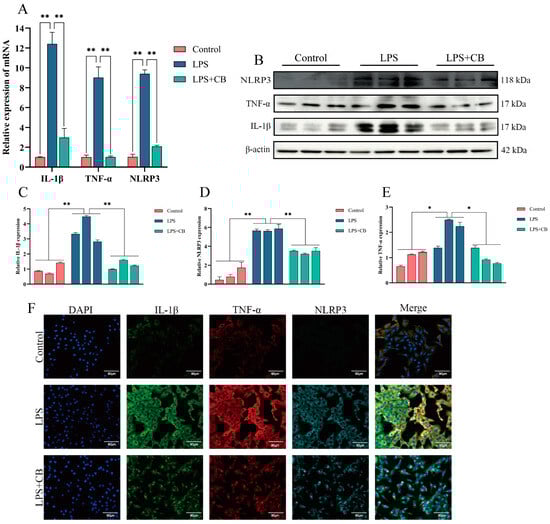 CB has been shown to have potent anti-inflammatory effects. To investigate its impact on LPS-induced inflammatory responses in MAC-T cells, qPCR and Western blot were used to assess the mRNA and protein expression of IL-1β, TNF-α, and the NLRP3 inflammasome. The LPS + CB group exhibited significantly lower levels of these inflammatory markers compared with the LPS group (Figure 4).