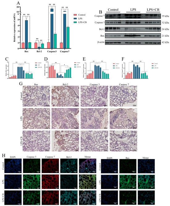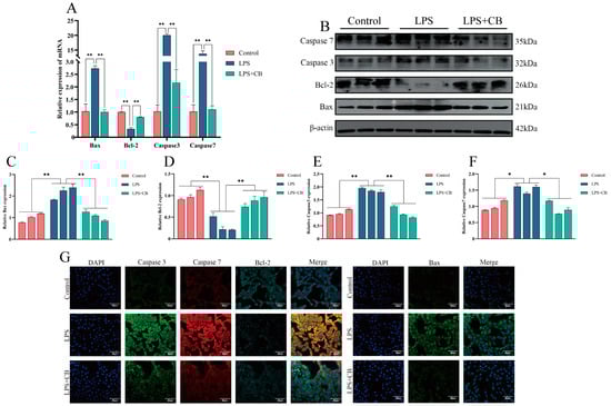 To further explore CB’s regulatory effects on apoptosis in inflammatory conditions, qPCR, Western blot, IHC, and IF were used to assess apoptosis-related protein expression in mouse mammary cells. The LPS + CB group showed a significant increase in Bcl-2 expression and significant decreases in Bax, Caspase 3, and Caspase 7 expression compared with the LPS group (Figure 8).