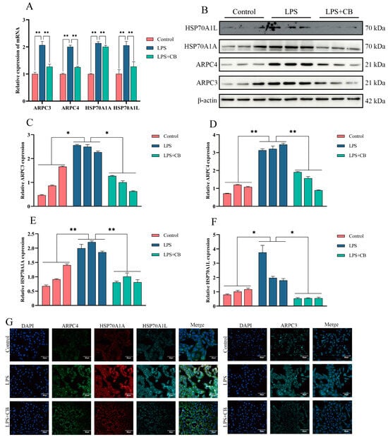 To further elucidate the anti-inflammatory mechanism of CB, qPCR, Western blot, and IF were used to examine the expression of ARPC3, ARPC4, HSP70A1A, and HSP70A1L in MAC-T cells. The results demonstrated that the LPS + CB group had a significantly lower expression of these markers compared with the LPS group, indicating that CB effectively suppresses their LPS-induced expression (Figure 6).