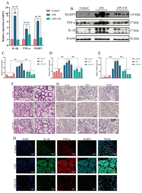 The effect of CB on the pathological damage of mammary gland in mice with LPS-induced mastitis and the effect of CB on the expression of inflammatory cytokines and the activation of NLRP3 inflammasome in mice with LPS-induced mastitis. (A) qPCR was used to detect the expression of inflammatory cytokines IL-1β, TNF-α, and NLRP3 inflammasome mRNA levels. (B–E) Western blot was used to detect the expression of inflammatory cytokines IL-1β, TNF-α, and NLRP3 inflammasome protein levels. (F) HE was used to observe the effect of CB on the pathological damage of mammary gland tissue in mice with LPS-induced mastitis. Scale bar: 100 μm (black line segment). (G,H) IHC and IF were used to detect the expression of inflammatory cytokines IL-1β, TNF-α, and NLRP3 inflammasome protein. Scale bar: 90 μm (white line segment),100 μm (black line segment). **, p < 0.01.