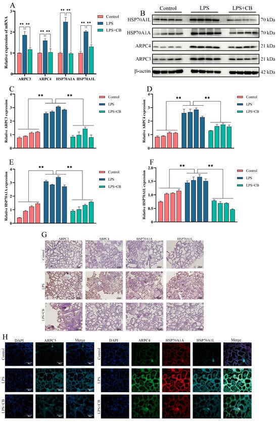 To further elucidate the anti-inflammatory mechanism of CB, qPCR, Western blot, IHC, and IF were used to measure the expression of ARPC3, ARPC4, HSP70A1A, and HSP70A1L in mouse mammary tissues. The LPS + CB group exhibited significantly lower levels of these proteins compared with the LPS group, indicating that CB effectively inhibits their LPS-induced expression (Figure 9).