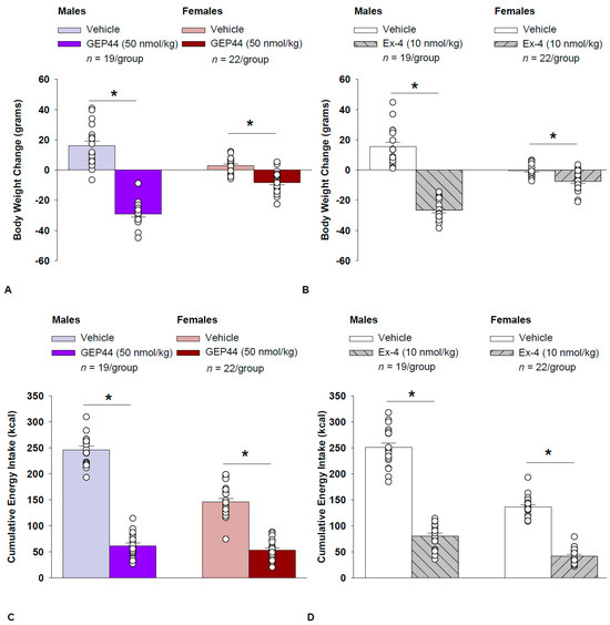GEP44 treatment significantly reduced cumulative energy intake following treatment days 1 and 2 in both male (Figure 1C; p < 0.05) and female rats (Figure 1C; p < 0.05). In males, GEP44 reduced cumulative 24 and 48 h energy intake by approximately 76.6 ± 3.1% and 74.6 ± 2.3%, respectively. In females, GEP44 reduced cumulative 24 and 48-h energy intake by approximately 57.4 ± 3.0% and 63 ± 2.4% suppression, respectively.