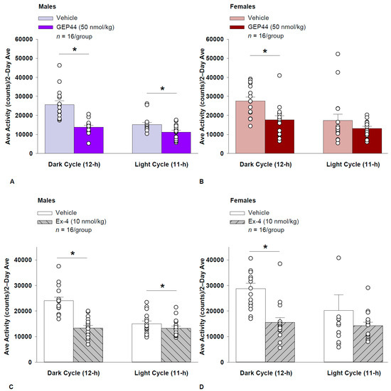 (A–D) Effects of the chimeric peptide, GEP44, or selective GLP-1R agonist, exendin-4, on ambulatory activity in male and female HFD-fed rats. Male (n = 16/group) and female (n = 16/group) rats were maintained on HFD (60% kcal from fat) for at least 4 months prior to being implanted with PDT-4000 telemetry devices into the abdominal cavity. During this study, animals remained in their home cages and were maintained on a 1-h fast. Animals received SC injections of vehicle (sterile saline/water) followed by GEP44 (50 nmol/kg; 1 mL/kg injection volume) or exendin-4 within 15 min prior to the start of the dark cycle in a counterbalanced design. (A/B) Effect of GEP44 on ambulatory activity during the light and dark cycle periods in (A) male and (B) female HFD-fed rats. (C/D) Effect of exendin-4 on ambulatory activity during the light and dark cycle periods in (C) male and (D) female HFD-fed rats. Ambulatory activity was averaged over the light (11 h) and dark (12 h) cycles across the 2-day vehicle and 2-day drug treatment periods. Data are expressed as mean ± SEM. * p < 0.05 GEP44 or exendin-4 vs. vehicle.