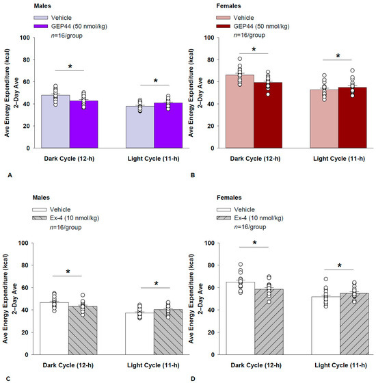 There were no differences between GEP44 and exendin-4 on EE during the light or dark cycles in male or female rats.