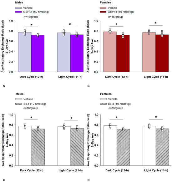 (A–D) Effects of the chimeric peptide, GEP44, or selective GLP-1R agonist, exendin-4, on RER (indirect calorimetry) in male and female HFD-fed rats. Male (n = 16/group) and female (n = 16/group) rats were maintained on HFD (60% kcal from fat) for at least 4 months prior to being implanted with PDT-4000 telemetry devices into the abdominal cavity. Animals were transferred to individual metabolic cages that were part of the CLAMS-HC indirect calorimetry system prior to receiving SC injections of vehicle (sterile saline/water) followed by GEP44 (50 nmol/kg; 1 mL/kg injection volume) or exendin-4 within 1.5 h prior to the start of the dark cycle in a counterbalanced design. (A/B) Effect of GEP44 on RER during the light and dark cycle periods in (A) male and (B) female HFD-fed rats. (C/D) Effect of exendin-4 on RER during the light and dark cycle periods in (C) male and (D) female HFD-fed rats. RER was averaged over the light (11 h) and dark (12 h) cycles across the 2-day vehicle and 2-day drug treatment periods. Data are expressed as mean ± SEM. * p < 0.05 GEP44 or exendin-4 vs. vehicle.