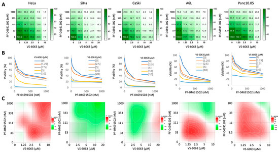 Synergy between PI3K and FAK inhibitors in cervical and pancreatic cancer cell lines. (A,B) Viability of cancer cell lines measured by CCK-8 assay after treatment with indicated combinations of PF-04691502 and VS-6063 for 48 h. The numbers represent the percentage of viability compared to that of DMSO control calculated from 3 independent experiments. (B) Comparison of PF-04691502 viability dose curve at different concentrations of VS-6063. (C) Bliss synergy score for PF-04691502 and VS-6063 calculated from (A,B) using SynergyFinder [39]. Red and green colors correspond to high and low synergy scores, respectively.