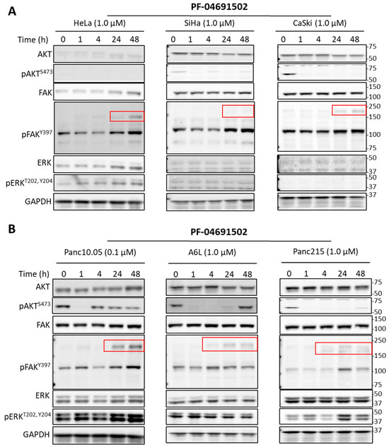 Immunoblotting of cervical (A) and pancreatic (B) cancer cells treated with PF-04691502. Cells were treated with PF-04691502 for different incubation periods and immunoblotted for total and phosphorylated forms of AKT, FAK, and ERK. GAPDH was used as a loading control. Red boxes indicate the extra bands above the expected FAK size (125 kDa) induced by PF-04691502 treatment.
