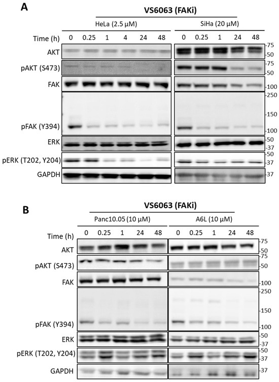 Immunoblotting of cervical and pancreatic cancer cells treated with FAK inhibitors. Cervical (A) and pancreatic (B) cancer cells were treated with VS-6063, and samples were taken at the indicated time points for immunoblotting of total and phosphorylated forms of AKT, FAK, and ERK, as well as the GAPDH loading control.