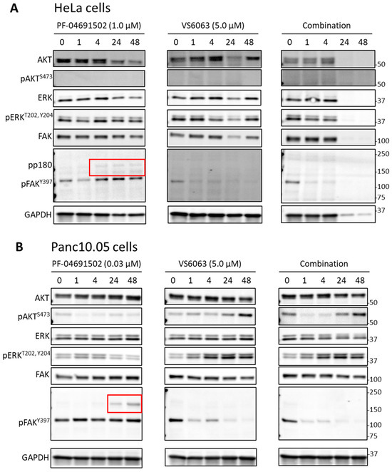 Immunoblotting of HeLa cells treated with PI3K and FAK inhibitors. HeLa cells (A) and Panc10.05 (B) cells were treated with PF-04691502, VS-6063, or the combination of the two inhibitors. Samples were taken at the indicated time points for immunoblotting of total and phosphorylated forms of AKT, FAK, and ERK, as well as the GAPDH loading control. Red boxes indicate the extra bands above the expected FAK size (125 kDa) induced by PF-04691502 treatment.